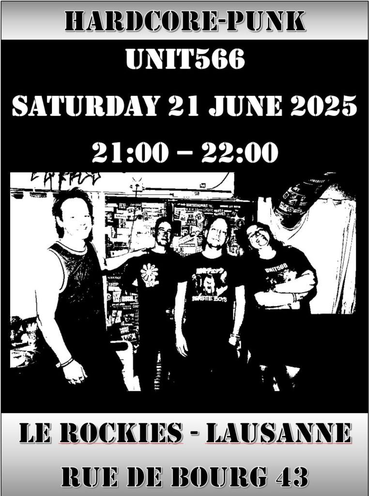 Le groupe suisse Unit 566, basé à Genève, joue un style ancré dans le hardcore punk, avec des textes en anglais et en français. Leur musique combine une base punk brute avec des touches de noise metal, des accents de rock progressif, et même des moments mélodiques ou lyriques — créant ainsi un mélange énergique et unique.